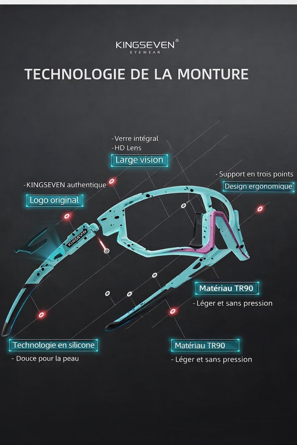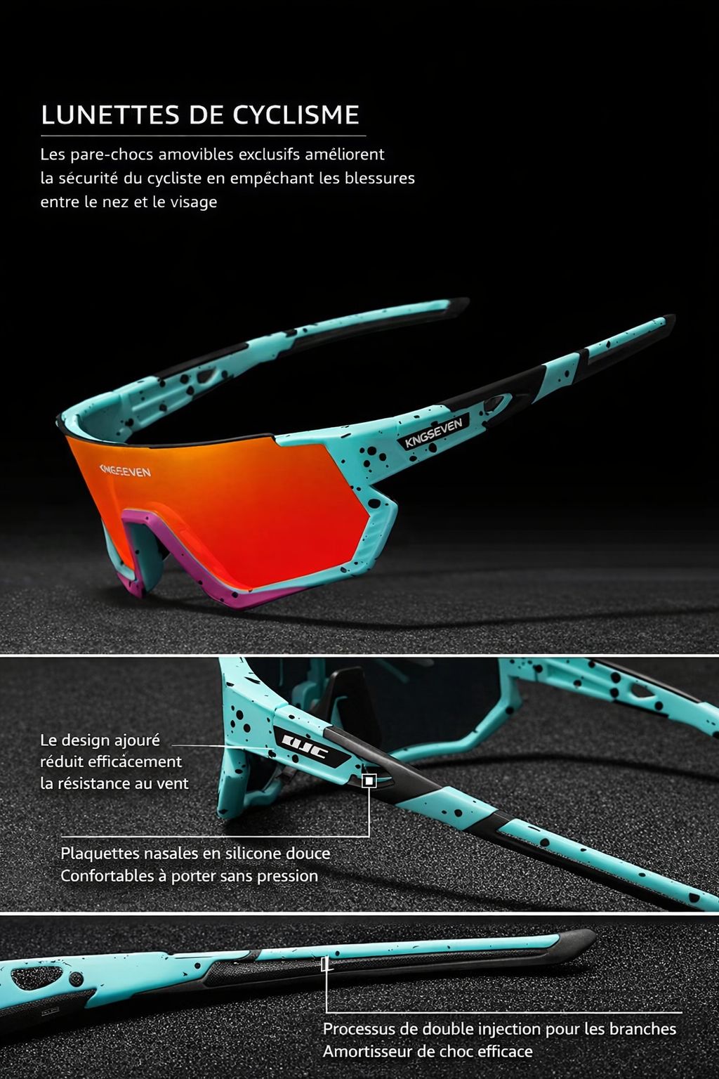 Le cadre en TR90 est ultra-léger, flexible et résistant aux chocs. Il assure un maintien parfait sans pression excessive, idéal pour le cyclisme sur route, le VTT et toutes les activités outdoor.